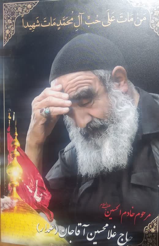 ضمن عرض تسلیت به خانواده محترم و بستگان مرحوم حاج غلامحسین آقاجان رحمت الله تعالی علیه و هیئات محترم مذهبی و به سرور گرامی حجت الاسلام و المسلمین حاج سید علی رئیس الواعظین که سالیان سال این مرد مخلص در بیت پدرشان به پذیرایی از عزاداران حسینی مشغول بودند از خداوند متعال برای ایشان رحمت و مغفرت واسعه الهی و حشر با اولیای الهی و برای بازماندگان صبر جمیل و اجر جزیل مسئلت می نمایم و از خوانندگان محترم میخواهم یک حمد و 4 سوره توحید و صلوات که ثواب 2 ختم قرآن دارد به روح ایشان و همه ی خادمان امام حسین علیه السلام هدیه نمایند .