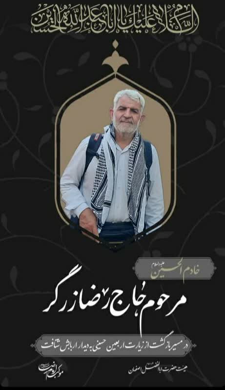 بار دیگر یکی از بهترین های آستان اهل بیت عصمت و طهارت علیهم السلام را از دست دادیم واقعا خبر بسیار ناگوار و تکان دهنده ای بود . خادم خوب و مخلص امام حسین علیه السلام آقای حاج رضا زرگر که عمری در راه اهل بیت علیهم السلام خدمتگزاری نمود پس از زیارت اربابش در ایام اربعین حسینی در مسیر بازگشت دارفانی را وداع و به دیدار مولایش شتافت .