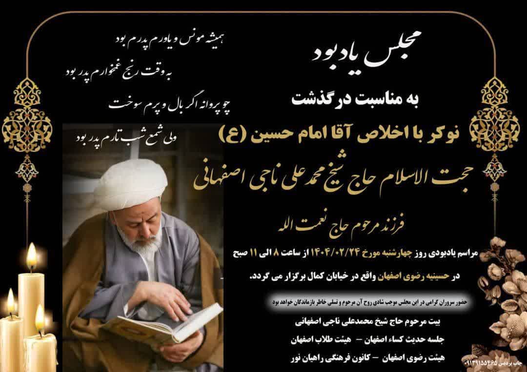 بار دیگر خبری غم انگیز را دریافت کردیم و یکی از بهترین های دوران خود را از دست دادیم . حجت الاسلام و المسلمین حاج شیخ محمد علی ناجی اصفهانی از محبین راستین اهل بیت عصمت و طهارت علیهم السلام در کمال ناباوری از میان ما رخت بر بست و به دیدار مولایش شتافت .