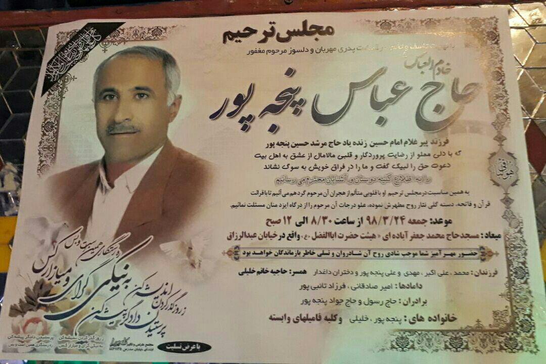 امسال هم چهاردهمین سالگرد ملکوتی پیرغلام آستان حسینی زنده یاد حاج مرشد حسین پنچه پور رحمت الله علیه بنیان گذار هیات حضرت ابوالفضل علیه السلام اصفهان در بیست و پنجم آبانماه رسید . در نظر داشتم که بمناسبت سالگرد ایشان مطلبی بنویسم ولی فرصت نشد تا اینکه دیروز عکسی را که دوست عزیز جناب آقای حاج رضا زرگر که از خادمین خوب حضرت اباالفضل علیه السلام هستند برایم فرستادند . این عکس مربوط هست به جشن ولادت باسعادت حضرت امام محمد تقی علیه السلام در حسینیه جوادالائمه علیه السلام اصفهان که هر ساله در روز دهم رجب جلسه جشن باشکوهی برگزار می کنند . جا دارد یاد کنم از خادم الجواد زنده یاد حاج احمد معظم که از بنیان گذاران و دستندرکاران اصلی این حسینیه بابرکت بودند . مرحوم حاج مرشد علاقه بسیاری به عزیز دل آقا امام رضا علیه السلام یعنی حضرت امام جواد علیه السلام دارند . تا جایی که یادم هست هرساله در این جلسه جشن روز ولادت در حسینیه جوادالائمه علیه السلام اصفهان شرکت می کردند و در بیشتر مواقع بنده ایشان را آنجا می دیدیم . به هرحال یک عکس دارای کلی خاطره خوب از افراد خوب است . جناب حاج آقا حسین چرخابی هم در عکس هستند که چند سال پیش به رحمت خدا رفتند ایشان هم از دوستاران خوب و مخلص اهل بیت علیهم السلام بودند و هرسال در منزل شان روضه ی باشکوهی در ایام فاطمیه برگزار می شد و خداوند متعال سایر دوستان که در این عکس هستند را بسلامت بدارد ان شالله مخصوصا سرور عزیز جناب آقای حاج حسن مجید که از پیشکسوتان خوب و مخلص هیئات مذهبی اصفهان و هیات ابوالفضل علیه السلام هستند .